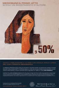 Al centro del visual, 'La femme aux macarons' di Modigliani, 'tagliata' dal 4,5% che indica il valore del rendimento lordo dell'obbligazione al prezzo di emissione. Il testo recita: 'Medioabanca Primo Atto. Scegli un investimento d'autore'.