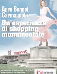 Bennet, azienda specializzata nel settore dei centri commerciali, dopo una gara che ha coinvolto più realtà ha affidato a Key Adv, agenzia creativa di Acqua Group, l’ideazione e la realizzazione della campagna a supporto del nuovo centro commerciale di Carmagnola, in provincia di Torino.Quello di Carmagnola, che verrà inaugurato ad agosto, è il decimo centro commerciale affidato da Gallerie Commerciali Bennet a Key Adv, che già si occupa della comunicazione di Brugherio Shopping Center (Brugherio, Milano), I Salici (Sacile, Pordenone), il Parco Shopping Center (Vanzaghello, Milano), Le Valli (Comacchio, Ferrara), Roero Center (Santa Vittoria d'Alba, Cuneo), Sedriano Shopping Center (Sedriano, Milano), La Porta d’Europa (Montano Lucino, Como), Ticino Center (Castelletto Ticino, Novara) e Sesia Center (Romagnano Sesia, Novara).