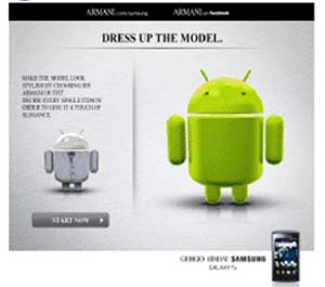 Un sito di prodotto che l’utente è invitato ad esplorare utilizzando il telefono stesso; un sito mobile per gli utenti che vorrano scoprire le caratteristiche del prodotto dal loro smartphone; un'applicazione su facebook - che permetterà agli utenti di vestire l’androide, simbolo del sistema operativo di Google, tramite un guardaroba co target=_blank"i migliori capi di abbigliamento e accessori Armani; una campagna banner internazionale; la diffusione del video virale all’interno del quale vediamo l’androide sfilare per la prestigiosa griffe - http://www.youtube.com/watch?v=kU3_SwFvDQUGroup Executive Creative Director: Vicky Gitto