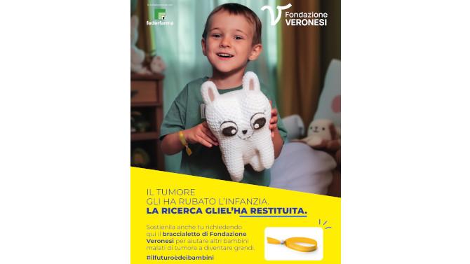 Il key visual, che ritrae un bambino guarito accompagnato dalla frase “Il tumore gli ha rubato l’infanzia. La ricerca gliel’ha restituita.”, racconta con delicatezza e verità la missione di Fondazione Veronesi: sostenere la ricerca scientifica per ridare futuro, gioco e leggerezza ai piccoli pazienti.