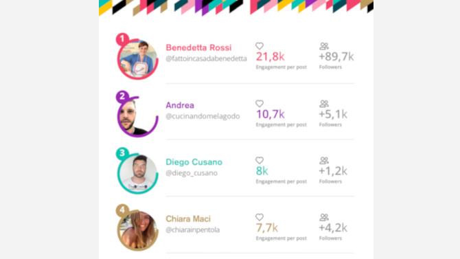 Al quarto posto perde due posizioni rispetto alla classifica 2018, Chiara Maci (@chiarainpentola), che oggi colleziona una media di 7.700 interazioni per post e 4.200 nuovi follower. Nicolò, Andrea e Lello di @chefincamicia, già vincitori della classifica Rising Star dei migliori food YouTuber, chiudono la classifica dedicata a Instagram. Grazie a diversi format e livelli di difficoltà dei piatti sono riusciti a totalizzare 6.900 interazioni per post, oltre 26.000 nuovi seguaci e a produrre, nel solo mese di ottobre, ben 116 contenuti.