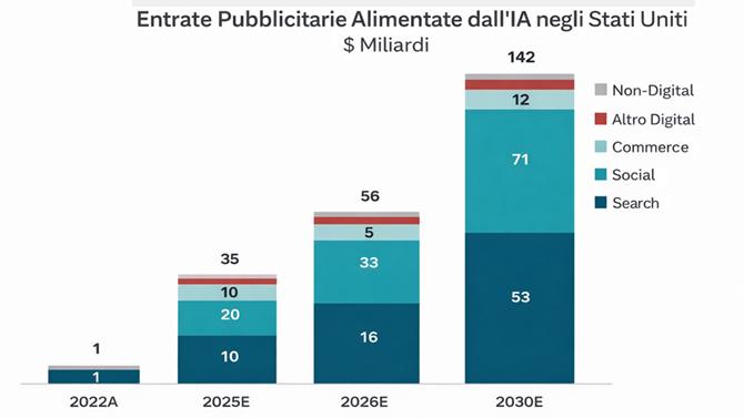 Il dato più immediato riguarda la dimensione economica: nel 2030 la spesa pubblicitaria gestita da piattaforme AI-powered raggiungerà i 142 miliardi di dollari, pari al 26% dell’intero mercato advertising statunitense. Nel 2025 questa quota era pari all’8%, circa 35 miliardi. Una crescita con CAGR del 29%, che non nasce tanto dall’espansione complessiva del mercato, quanto da una riallocazione dei budget verso sistemi automatizzati più efficienti.
