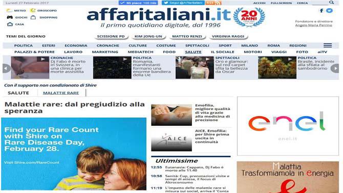 In occasione della Giornata delle Malattie Rare (28 febbraio), Affaritaliani.it - il primo quotidiano online italiano, fondato nel 1996 - e Shire – azienda biotech leader nelle malattie rare – inaugurano una nuova rubrica interamente dedicata alle malattie rare all’interno della sezione Salute del giornale (http://www.affaritaliani.it/sport-emofilia).