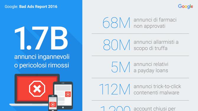 Bad Ads Report di Google: nel 2016 raddoppiati gli annunci rimossi, a quota 1,7 mld