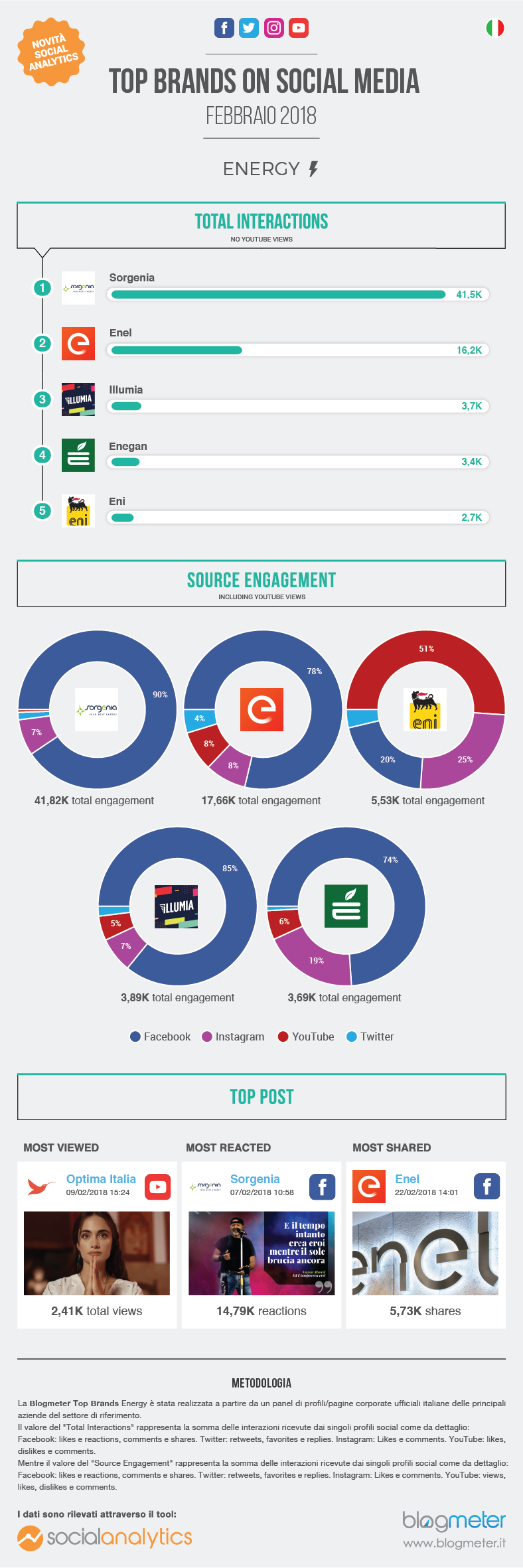 Blogmeter torna con il suo appuntamento fisso della Top Brands, questa volta dedicata al Settore Energy. La classifica dei brand più engaging sui principali social media è stata effettuata utilizzando il nuovo tool di Social Analytics, uno strumento migliorato sia dal punto di vista grafico sia nelle funzionalità, che permette di mettere a confronto non solo i diversi brand, ma anche i diversi canali social di un singolo brand.