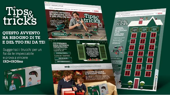 È partito il 1° dicembre il concorso a premi 'Tips & Tricks' ideato e gestito da A-Tono per Bosch, valido fino al 24 dicembre, che mette in palio complessivamente 24 set natalizi composti dal cacciavite a batteria IXO e dalla versione giocattolo uguale all’originale, IXOlino.
