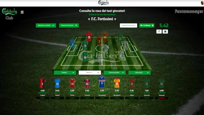 Il progetto, attivato con OMD, consente - registrandosi su www.carlsbergclub.com - di accedere direttamente a tutti i contenuti, di impostare la propria formazione oppure di farsi consigliare quella vincente dal sistema. Grazie alla partnership con OPTA, società che fornisce evidenze statistiche alle testate sportive e ai telecronisti, gli utenti vengono aggiornati settimanalmente sul valore dei giocatori in base ad informazioni quali: la loro performance, la forma fisica, eventuali infortuni e le probabilità di schieramento partita dopo partita.