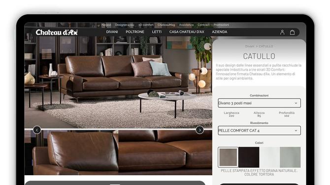 Disponibile sia nella versione desktop, sia in versione ottimizzata per i device mobili, il sito e-commerce offre una user experience evoluta che permette comodità di visualizzazione e facilità di acquisto. La collezione Chateau d'Ax acquistabile online è composta da un'ampia selezione di divani e poltrone tutti facilmente configurabili in tempo reale per versioni, colori e materiali per rendere l'esperienza ancora più vicina a quella del negozio.