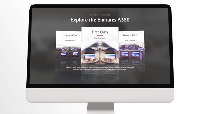 Emirates lancia su emirates.com i modelli di sedili 3D, divenendo la prima compagnia aerea a introdurre su piattaforma digitale la tecnologia di realtà virtuale del web (VR). Il modello dei sedili 3D è uno strumento di visualizzazione che abilita una visione 3D a 360 gradi degli interni dell’A380 e del Boeing 777 di Emirates, regalando ai propri clienti la possibilità di scoprire non solo i posti e lo spazio di cabina, ma anche i numerosi prodotti Emirates presenti a bordo.