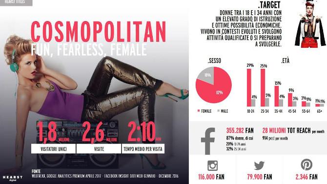 Gli ultimi dati, diffusi ad aprile 2017, rivelano come Cosmopolitan sia in grado di raggiungere 2,6 milioni di visite al mese (1,8 milioni i visitatori unici), con una reach social di più di 30 milioni di contatti mensili.
