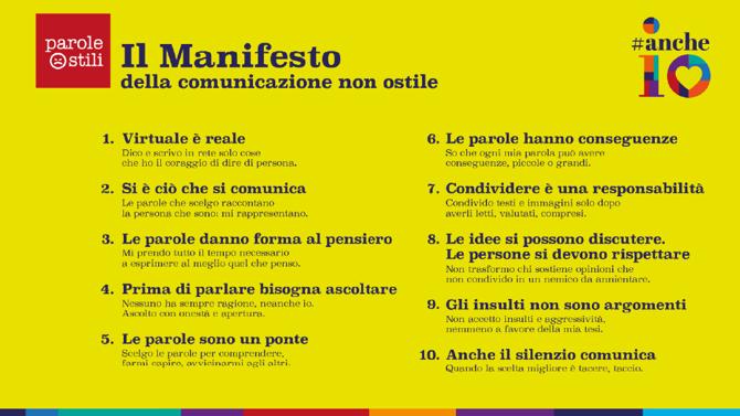 L'appuntamento più importante però sarà dato a tutti gli utenti della Rete, i quali verranno invitati a colorare la Rete di giallo (colore simbolo dell’associazione), condividendo ognuno con il proprio estro, uno o più principi del Manifesto. Tutte le info per partecipare alla pagina: paroleostili.it/anche-io-manifesto.