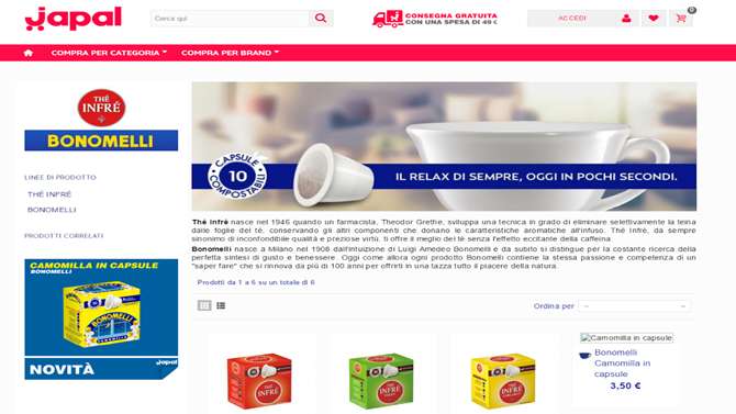 Attualmente su Japal.it sono in vendita tutti i prodotti dei brand: Petti, Arbre Magique, Coppertone, Orphea, Bemama, Mister Magic, Podovis, My Car, STP, NexTech ed ora le capsule Thé Infré e Bonomelli.