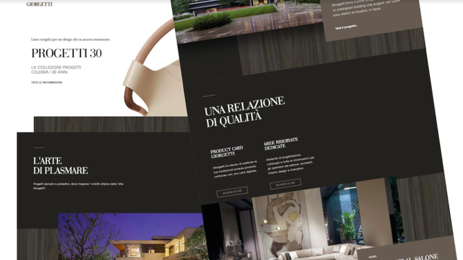 La narrazione del mondo Giorgetti è affidata a un layout fresco e dinamico, in grado di valorizzare al meglio la ricerca e l’attenzione al dettaglio, tipici del brand: le immagini in movimento restituiscono la vitalità dei progetti dell’azienda e suggeriscono un’interazione fra utente e prodotti.