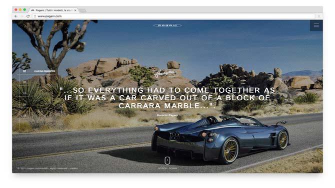 Una piattaforma che fa del visual storytelling il suo tratto distintivo, attraverso l’utilizzo di immagini e video in full screen che permettono all’utente di immergersi immediatamente nel mito Pagani, esaltando le linee dei diversi modelli e trasmettendo le sensazioni uniche che può vivere chi si mette al volante. Il sito si caratterizza inoltre per un design pulito e minimale e un costante dialogo tra immagini e parole, tratte dai racconti in prima persona di Horacio Pagani.
