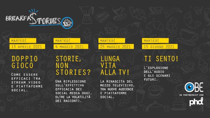 Al via il 13 aprile una nuova edizione di Breakfaststories, le «colazioni in diretta streaming» proposte da OBE - Osservatorio Branded Entertainment, l’Associazione che studia e promuove la diffusione sul mercato italiano del branded content & entertainment come leva strategica per la comunicazione integrata di marca, in collaborazione con PHD Media Italia, agenzia media di comunicazione e marketing di Omnicom Media Group.