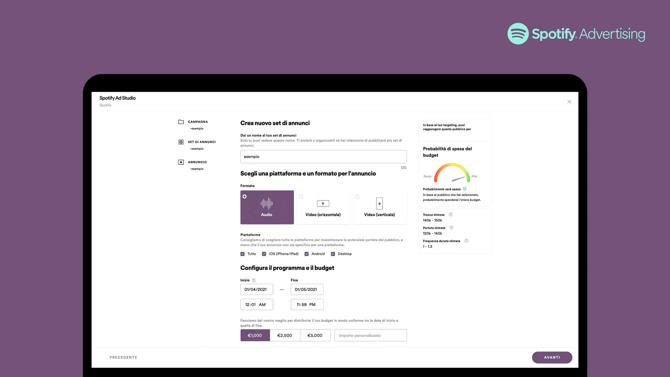Spotify lancia oggi in Italia Ad Studio, la piattaforma pubblicitaria self-service che rende facile per chiunque creare e gestire direttamente campagne pubblicitarie audio e video su Spotify. A partire da un investimento minimo (250€), inserzionisti di ogni tipo e dimensione - imprese locali, concessionarie, catene di supermercati, negozi di elettronica, istituti e università per la promozione di corsi, open day o altre attività - hanno ora accesso alla streaming intelligence di Spotify. Inoltre, fornendo uno script, la piattaforma aiuta a creare annunci professionali in sole ventiquattro ore, senza costi aggiuntivi.