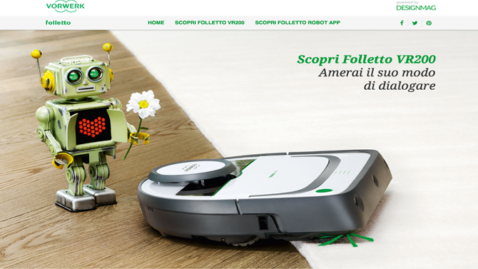 Advertising con Rich Media e interfaccia grafica realizzati ad hoc, contenuti dedicati, foto e video, attività social: così Trilud Group, in collaborazione con la sua agenzia creativa BrandMade, svela su Designmag.it per 5 settimane la tecnologia innovativa di Folletto VR200, l’aspirapolvere robotizzato di nuova generazione.