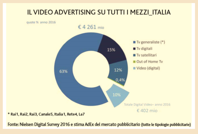 Il video rappresenta oltre il 17% del totale digital e si è caratterizzato nel 2016 per una crescita del 14% circa. Secondo le nostre stime sulla spesa pubblicitaria, la crescita messa a segno lo scorso anno può ripetersi anche nel 2017. Inoltre possiamo aggiungere che la quota dell’online video rappresenta il 10% dell’intero sistema pubblicitario riconducibile al video, stimato in oltre 4 miliardi, includendo televisione, out of home tv e digital (apri la gallery, immagine 3, ndr).