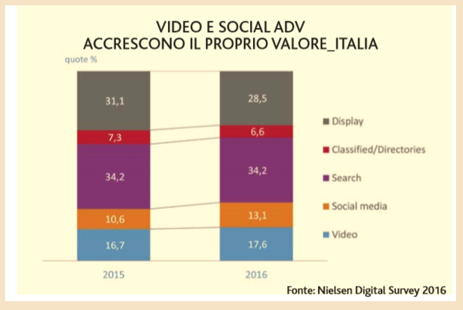 L’andamento dell’internet advertising è in costante aumento: i dati di Nielsen per il 2016 parlano di una crescita dell’8% rispetto all’anno precedente, con una quota di quasi il 28% sull’intero mercato della pubblicità in Italia. Social e video sono i principali due driver di crescita: sulla base delle nostre stime, il loro incremento 2016 è stato ‘double digit’ con una quota pari a un terzo del mercato dell’online advertising (apri la gallery, immagine 2, ndr). Search e display si spartiscono gli altri due terzi. Si stima che la crescita del digital advertising per il 2017 possa essere tra l’8 e il 10%, anche se è presto per fornire previsioni accurate.