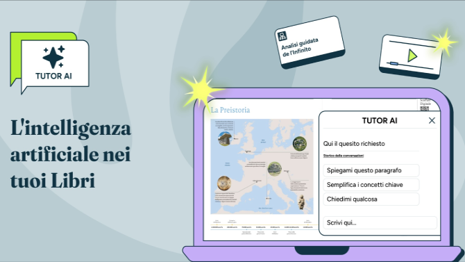 Il Tutor AI del Libro Digitale è un compagno di studio virtuale progettato per accompagnare le ragazze e i ragazzi nel percorso di apprendimento. Non sostituisce il libro, ma lo valorizza, diventando un alleato: offre spiegazioni chiare ed esempi mirati, rielaborando le informazioni testuali e visuali per renderle più comprensibili e generando momenti di verifica utili a consolidare le conoscenze.