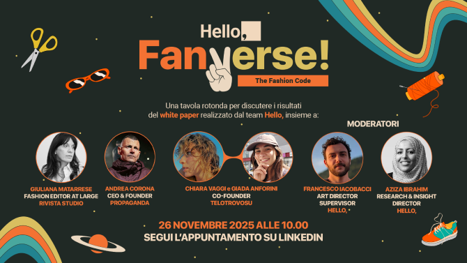 Con “Fanverse! – The Fashion Code”, Hello invita professionisti e appassionati del settore a un confronto aperto sul futuro del fashion marketing e sul ruolo dei brand in un panorama in cui la moda non è più solo estetica, ma una forma di appartenenza culturale.