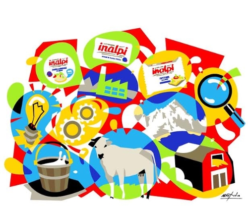Ugo Nespolo, noto artista torinese, è stato incaricato di interpretare il mondo Inalpi e i suoi valori in un’opera che verrà esposta ad Expo all’interno del padiglione Federalimentari a partire dal 25 giugno. Inalpi è un’azienda lattiero casearia che produce Burro, Fettine e Formaggini a base di latte italiano , seguendo i valori del “giusto, buono, sicuro”. Nella sua opera Nespolo evidenzia come il mondo Inalpi ruoti intorno alla mucca , elemento centrale della promessa Inalpi e produttrice dell’ingrediente principale di tutti i suoi prodotti, il latte. La lampadina , metafora dell’idea Inalpi di produrre formaggini e fettine con il 40% di latte e burro a base di panna fresca sottolinea la peculiarità di Inalpi rispetto ai propri competitor.