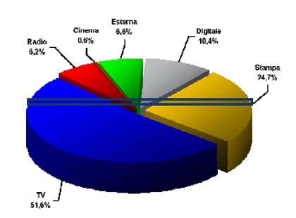Il peggio è passato, il mercato torna a crescere e secondo le stime di AssoComunicazione, rese note oggi, 30 giugno, a Milano a ‘Comunicare domani’, nel 2010 il mercato avrà un valore di 23,27 mld con una crescita del 2,3%, trainata soprattutto dalla televisione (+3,9%. 4,9 mld) che, sia nelle nuove reti che nelle generaliste (+3%) recupera quote e resta uno dei mezzi centrali per le aziende, con una share del 51%, grazie a una più ampia piattaforma di emissione in cui il digitale terrestre e il satellite allargano significativamente il loro peso. Notevole l'apporto della volata di internet (+11,7%. 987 mld) sull’onda di una crescente integrazione dei 'video' nelle pianificazioni media. Da sottolineare come internet raggiunga una share del 10,4%.Buoni segnali dalla radio (+2,8%. 4,9 mld) e dal cinema (+1,8%. 56 mln), favorito dalla digitalizzazione delle sale e dal 3D; in leggero rialzo il dato dell’esterna (+1% 624 mln). Soffre ancora la stampa (-4,6%. 2,34 mld), soprattutto la periodica (-9,3%. 960 mln) mentre la quotidiana segna -1%. 1,38 mld. Arrivando a un valore totale dei mezzi classicidi 9,5 mld, (+2,1%), che, considerando i costi di produzione che lievitano dell’1,3%, toccherà i 10,35 mld di euro.