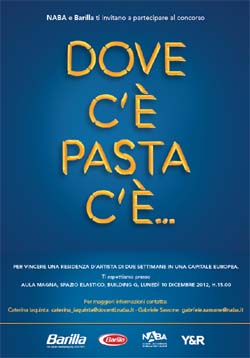 Barilla, in collaborazione con Naba, la Nuova Accademia di Belle Arti di Milano e Y&R Group, lancia il progetto 'Dove c’è pasta c’è…', con l’obiettivo di sostenere e stimolare la creatività dei giovani artisti sul tema della pasta. 400 studenti del Dipartimento di Arti Visive, Performative e Multimediali NABA, diretto da Marco Scotini, sono invitati a interpretare il valore della pasta con il linguaggio delle performing arts, un’espressione artistica innovativa capace di creare un’interazione diretta con il pubblico attraverso la sintesi di diverse forme d’arte visiva (danza, recitazione, scenografia, allestimento video) in un unico spettacolo. Gli studenti possono iscriversi fino a lunedì 4 febbraio 2013.Da febbraio ad aprile gli studenti lavoreranno in gruppi multidisciplinari formati da 4 persone, ognuno con competenze artistiche diverse: una giuria formata dal regista Bob Wilson più gli esperti di Naba e rappresentanti di Barilla e Y&R Group selezionerà gli elaborati di sei gruppi finalisti nel mese di maggio. (In allegato il pdf).