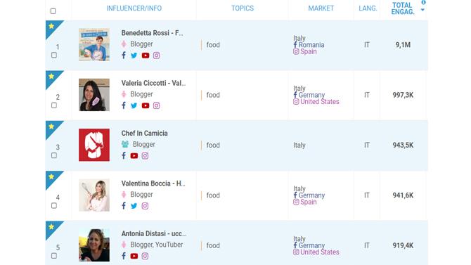Al quarto e al quinto posto si classificano rispettivamente Valentina Boccia, fondatrice del blog 'Ho voglia di dolce', e Antonia Distasi, conosciuta sui social come uccia3000. Valentina, specializzata in ricette dolci, vanta oltre 1,7 milioni di fan sui suoi canali social e grazie a loro guadagna un total engagement pari a 941 mila interazioni. Antonia, invece, grazie soprattutto alle video-ricette pubblicate sul suo canale YouTube, ottiene 919 mila interazioni totali.