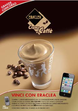 Dal 15 marzo al 30 giugno, acquistando un carnet abbonamento da 10 consumazioni più una omaggio di Crema al Caffè Eraclea, il cliente potrà vincere immediatamente con semplice sms uno dei 50 iPhone 4 32 Gb in palio.Ogni volta che un consumatore vince, viene premiato anche il barista.