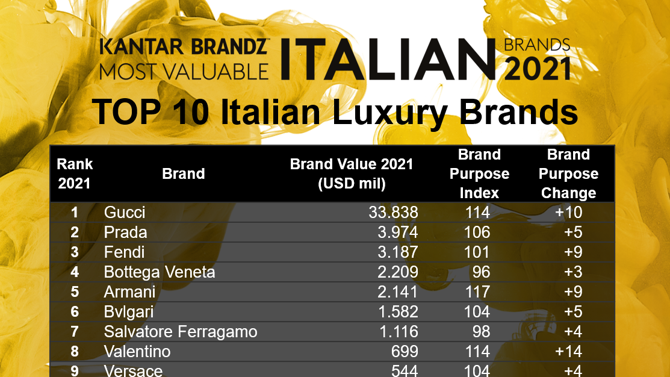 È quanto emerge dallo studio Kantar Brand Most Valuable Italian Brands, che per la prima volta quest’anno si è focalizzato sul vertical dei luxury brand: il ranking dei TOP 10 brand italiani del settore è stato presentato oggi nel corso dell’evento digitale “How great Luxury brands grow in tough times”.