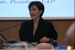 Proprio sul tema della tutela della donna e dell’integrazione tra interessi pubblici e controllo volontario della pubblicità ha dato il proprio contributo il Ministro Carfagna (foto 2), il cui Dicastero ha recentemente firmato un Protocollo d’intesa con l’Istituto di autodisciplina pubblicitaria che permette al ministero delle Pari Opportunità di chiedere il ritiro immediato delle immagini e delle pubblicità che offendono la dignità della donna e non rispettano le pari opportunità. (leggi news ) "La pubblicità è uno 'strumento potentissimo' per confermare o per sfatare gli stereotipi - ha dichiarato il Ministro - . "Affermare le pari dignità è un principio di convenienza per un Paese in crisi - ha spiegato il Ministro Carfagna - più donne nei ruoli chiave portano un aumento del Pil ma ancora è difficile per le donne fare carriera, sia per via degli scarsi supporti durante la maternità sia per via di stereotipi diffusi anche dalla stessa pubblicità. La prevalenza di uomini nei consigli di amministrazione non dipende dalla mancanza di profili di donne adeguati. E’ un problema di cultura" ha commentato l'onorevole.