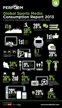 Perform Group, azienda specializzata nella distribuzione di contenuti sportivi su mezzi digitali, presenta al mercato i nuovi risultati del Global Sports Media Consumption Report 2013, ricerca, giunta alla sua terza edizione e realizzata in collaborazione con Kantar Media Sport e TV Sports Markets, che ha come obiettivo l'analisi delle tendenze di come gli appassionati di sport consumano contenuti sportivi in un panorama media in continua evoluzione e al momento rappresenta uno dei più autorevoli studi sull'andamento del mercato dei contenuti sportivi a livello mondiale, con focus su 14 mercati nazionali tra cui Australia, Brasile, Cina, Francia, Germania, Giappone, Gran Bretagna, India, Russia, Spagna, USA e Italia. Per quanto riguarda il panorama italiano, secondo i risultati del Report 2013 oltre l'80% della popolazione dichiara di seguire almeno uno sport. La TV rimane il primo canale di consumo, anche se la fruizione di contenuti attraverso altri mezzi sta crescendo notevolmente. Il 60% degli appassionati seguono lo sport online, e il 19% di questi lo ha fatto attraverso un servizio a pagamento negli ultimi 12 mesi. Il mobile è utilizzato dal 37% di chi consuma contenuti sportivi sul (nel 2011 eravamo al 29%) e il 29% degli appassionati italiani seguono lo sport anche attraverso piattaforme di social network (nel 2011 eravamo al 27%), come Facebook e YouTube.