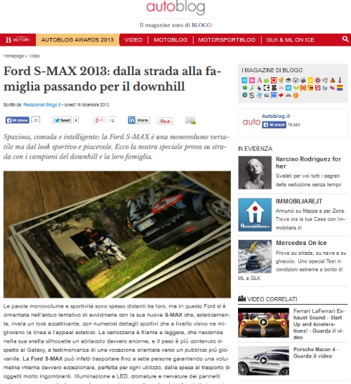 Il progetto punta su un innovativo approccio al branded content attraverso la produzione di contenuti di qualità realizzati in esclusiva per Ford dal team di Blogo Motori. Il progetto è articolato sulla creazione di contenuti multimediali esclusivi (reportage fotografici e video di qualità broadcast) per raccontare in modo coinvolgente al pubblico di Blogo Motori la versatilità e le caratteristiche tecniche delle ultime novità lanciate da Ford. In parallelo, per aumentare l’engagement del pubblico, è stata prodotta e promossa in modalità social-video su Blogo.it una clip emozionale con protagonista Emiliano Ferri, pluricampione italiano di MTB Downhill, mentre si cimenta in una sfida domestica tra famiglia e mountain-bike a bordo della nuova S-MAX.