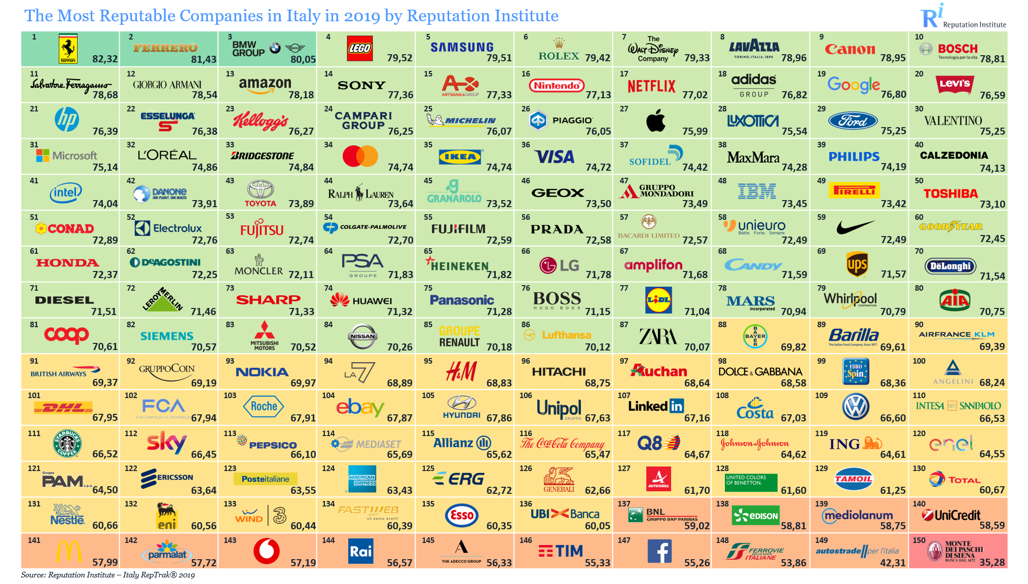 Il Cavallino rampante risulta infatti essere l’azienda più reputata tra i consumatori italiani, seguita da Ferrero e BMW Group che scala ben 13 posizioni rispetto allo scorso anno, spodestando dal gradino più basso del podio 2018 The Walt Disney Company che si piazza in 7° posizione.