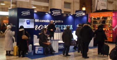 Carta Igienica Tempo ha personalizzato l’interno dei centri commerciali attraverso uno stand particolarmente caratterizzante e un’attività coinvolgente, con l’obiettivo di stimolare e promuovere l’acquisto del prodotto. La dinamica aveva l’obiettivo di dare alla carta igienica Tempo un contatto diretto con il consumatore, coinvolto e premiato attraverso un cadeau personalizzato.
