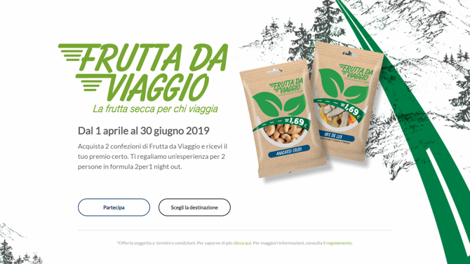 “Parti con Frutta da Viaggio” è la promozione a premio appena lanciata da Euro Company, legata alla propria linea di prodotti “Frutta da Viaggio”. Dal 1° aprile al 30 giugno acquistando due confezioni a scelta di Frutta da Viaggio all’interno dei punti vendita Autogrill dislocati in tutt’Italia, si avrà in omaggio un soggiorno di due notti (di cui una gratuita e la seconda a pagamento), per due persone.
