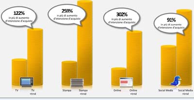 Affiancando l’advertising sulla carta stampata al marketing passaparola, l’efficacia del messaggio sull’intenzione d’acquisto aumenta del 259%, e i risultati sono visibili anche nel caso di tv (+122%), pubblicità online (+302%) e social media (+91%): ciò è reso possibile dall’azione dei messaggi dell’advertising combinata con i consigli e le opinioni credibili provenienti dalla propria cerchia sociale.
