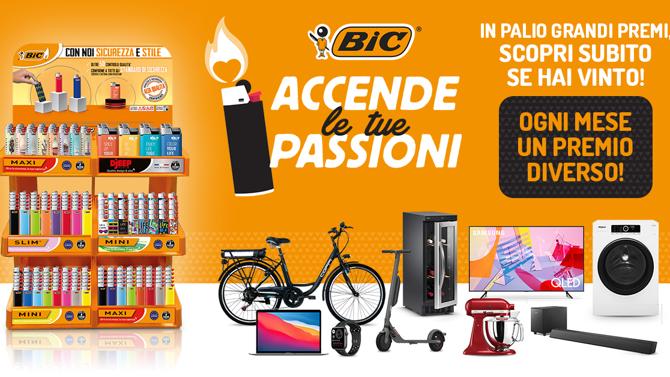 La promozione prevede che tutte le tabaccherie che acquisteranno l’espositore contenente un mix assortito di accendini BIC e lo esporranno all’interno del proprio punto vendita, potranno partecipare al concorso “Bic accende le tue passioni”, che vede in palio premi diversi tutti i mesi (planetaria Kitchen Aid, e.bike in acciaio Masciaghi, Apple Watch, monopattino elettrico Ninebot, cantina vini, MacBook Apple, smart tv Samsung, soundbar Philips, lavatrice Whirlpool), di grandi brand.