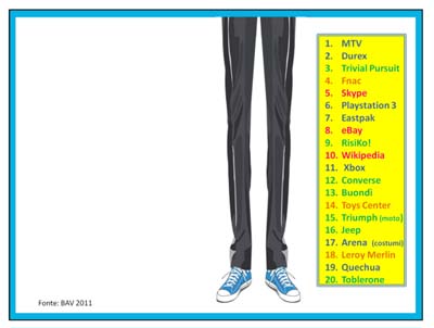 Presentata quest’oggi, la rilevazione Bav Italia 2011, valido strumento di conoscenza del valore e delle potenzialità delle marche messo a punto dall’agenzia Y&R Brands, mette in risalto le marche cui viene attribuito un maggiore potenziale di crescita nel prossimo futuro. La classifica è guidata da Mtv e Durex, seguiti da Trivial Pursuit, Fnac, Skype, Playstation 3, Eastpak, eBay, Risiko e Wikipedia. Sono loro i brand con le ‘gambe più lunghe’.