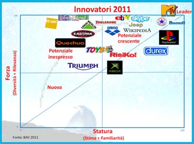 A differenza di quanto fatto in passato (la precedente rilevazione risale al 2009), questa volta l’indagine italiana del 2011 si è concentrata sui brand che non sono ancora in cima alla classifica nella percezione del grande pubblico, ma che hanno ottime chance di centrare questo risultato nel prossimo futuro, perché maggiormente apprezzate dalla categoria psicografica degli Innovatori, che anticipano i tempi, dettando le tendenze che presto verrano adottate da tutti gli altri.