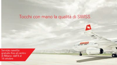 “Dall’ 8 ottobre - racconta Frigo -, grazie al nostro comodo servizio di transfer con cinque mini-van, brandizzati con colori e simboli Swiss, offriamo ai viaggiatori in arrivo alla stazione di Porta Garibaldi trasferimenti gratuiti per il centro di Milano al fine di promuovere le ottime coincidenze disponibili via Zurigo il servizio accurato e le convenienti tariffe verso numerose destinazioni intercontinentali. Uno spazio dedicato con una grande coda d’aeromobile stilizzata, dei totem posizionati all’interno della stazione, un grande impianto pubblicitario e cinque cortesi hostess informeranno il pubblico invitandolo ad usufruire del servizio e indirizzandolo direttamente ai mini van”. Il servizio sarà attivo per tutta la settimana dall’8 al 14 ottobre (dal lunedì al venerdì dalle 8 alle 18, sabato e domenica dalle 9 alle 19).