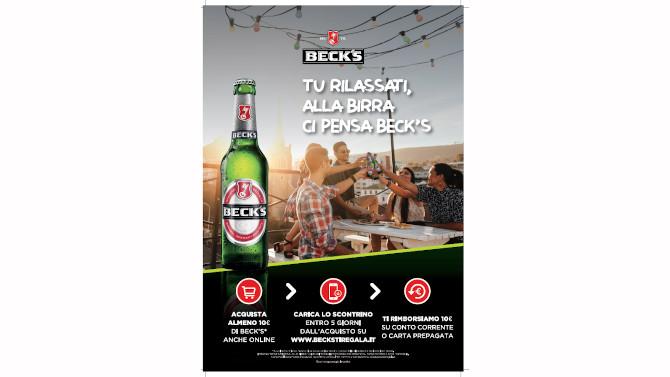 Dal 15 giugno al 26 luglio 2020, acquistando almeno 10€ di Beck’s in unico acquisto (anche tramite spesa online), si avrà la possibilità di ricevere un rimborso di 10€ direttamente sul conto corrente o carta prepagata. Per usufruire del rimborso, bisognerà caricare i dati dello scontrino sul sito dedicato (beckstiregala.it) entro 5 giorni dall’acquisto. Una volta completata la registrazione e confermata la richiesta attraverso il link comunicato via mail, si otterrà il rimborso.