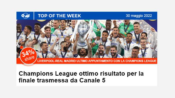 Si è conclusa con la vittoria del Real Madrid sul Liverpool la finale di Champions League edizione 2021-2022 trasmessa su Canale 5. L'attesa per una finale di Champions League è sempre trepidante per gli appassionati di calcio, particolarmente quest’anno con i fatti che hanno preceduto il match. Ottimi i risultati d'ascolto dell'evento sportivo che ha registrato una media di 6,1 milioni di individui con una share del 34% e del 44% sugli uomini 25-54 anni.