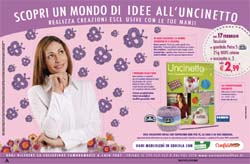 I due settimanali Mondadori presentano la nuova iniziativa Uncinetto e Filet. La prima uscita sarà in edicola il 17 febbraio al prezzo lancio di 2,99 euro (rivista esclusa). Tutte le uscite successive saranno in edicola a 5.99 euro. Ogni uscita comprende un fascicolo (16 schede) più un gomitolo da 25 gr. di filato 100% cotone a marchio DMC.
