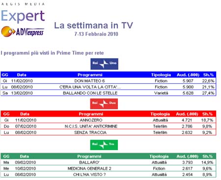 Settimana dal 7 al 13 febbraio Su Raiuno, la fiction 'Don Matteo 6' con un ascolto medio di 5,9 milioni si piazza in prima posizione superando per un soffio la fiction 'C’era una volta la città dei matti…' (5,9 mio e 21,1% di share) che ripercorre la storia di Franco Basaglia. Terza posizione per il varietà 'Ballando con le stelle' (5,6 mio e 27,4% di share).