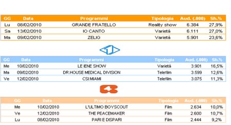 Nella settimana dal 7 al 13 febbraio il reality su Canale 5 è il programma più visto (27,9% di share). Secondo posto per il varietà 'Io canto' (6,1 mio) che vince la sfida del sabato sera; seguono i comici di 'Zelig' (5,9 mio e 23,6% di share). Su Raiuno prima posizione per la fiction 'Don Matteo 6', che totalizza un ascolto medio di 5,9 mln.