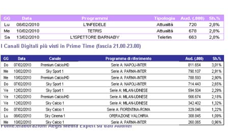 La classifica dei canali Digitali è guidata da Premium Calcio/HD con la partita di seria A 'Napoli-Inter' seguita da oltre 811 mila persone (3,0% di share) ed è interamente occupata da canali a contenuto sportivo eccezione fatta per Sky Cinema 1 che si piazza la 9° posto con il film 'Operazione Valchiria' (309 mila).