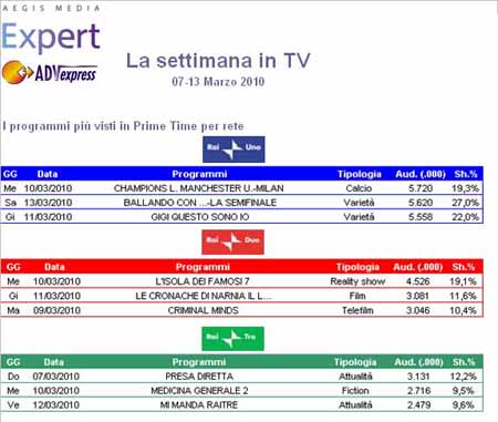 Su Rai Uno guida la classifica di rete dei programmi più visti della settimana la partita di Champions League “Manchester U.- Milan” con un ascolto medio di 5,7 milioni e una share del 19,3%. Al secondo posto si piazza la semifinale di “Ballando con le stelle” che vince la sfida del sabato sera (5,6 mio e 27,0% di share); segue il varietà condotto dal cantante Gigi D’Alessio “Gigi questo sono io” (5,5 mio e 22,0% di share).