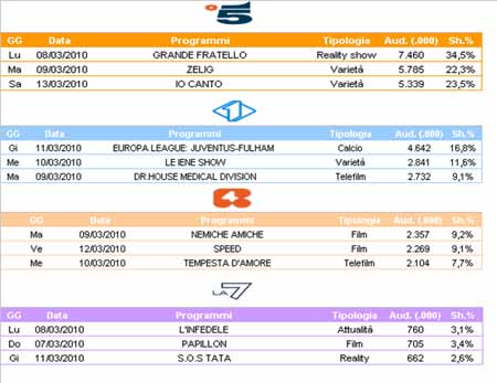 Nella settimana dal 07 al 13 marzo il reality di Canale 5 guida la classifica dei programmi più visti (share del 34,5%), medaglia d’argento per “Ballando con le stelle”, in onda su Rai Uno, che vince la sfida del sabato sera con 5,6 mio (27,0% di share) contro i 5,3 mio (23,5% di share) di Gerry Scotti e il suo “Io canto” su Canale 5.